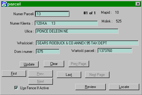 Uruchamiamy narzędzie VisualSQL (Key In - VSQL Review) i klikamy na cenrorid dowolnej parceli. Następnie naciskamy klawisz Review i przeglądamy centroidy parcel 13, 10, 11 (tych samych co z ćwiczenia 1.3.3. pkt. 4).