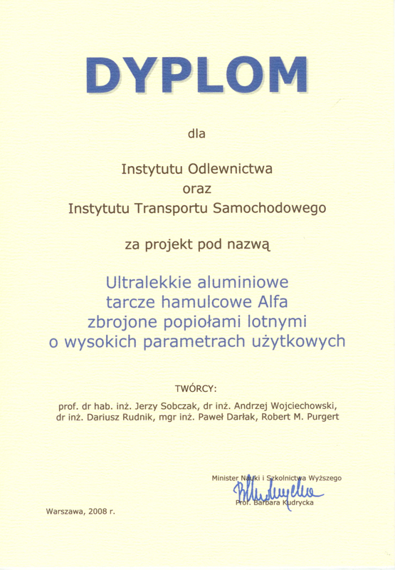 - dyplom Ministra Nauki i Szkolnictwa Wyższego – 2008