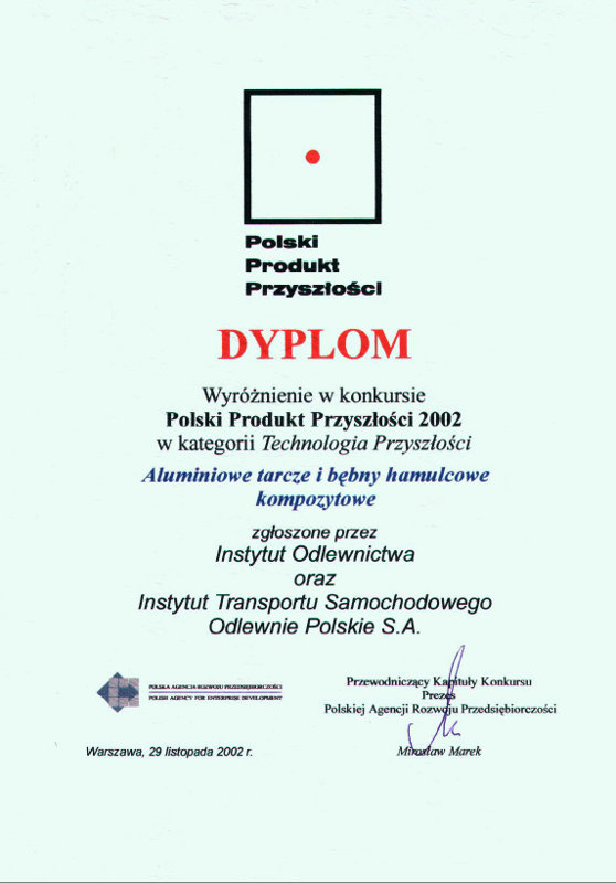 - wyróżnienie w kategorii „Technologia Przyszłości” w VI Edycji Konkursu „Polski Produkt Przyszłości” – od 2002