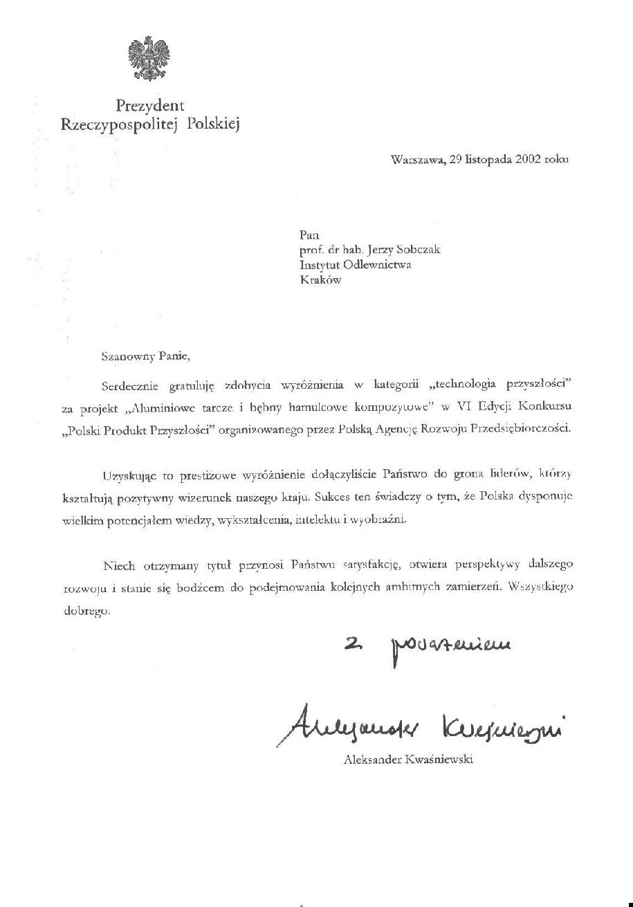 - adresat indywidualnego listu gratulacyjnego Prezydenta RP – 2002