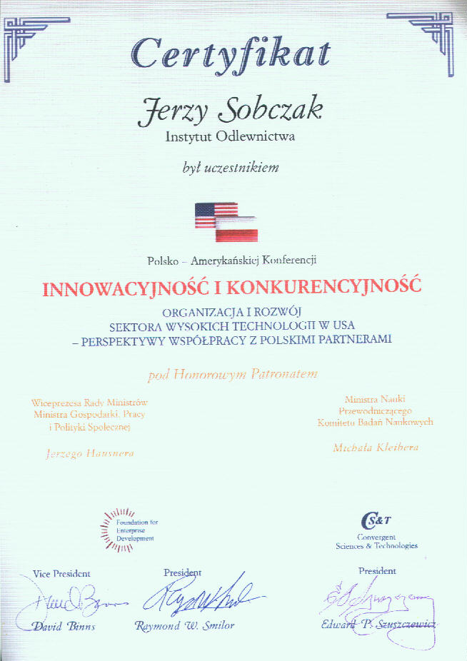 - certyfikat Polsko-Amerykańskiej Konferencji „Innowacyjność i Konkurencyjność”