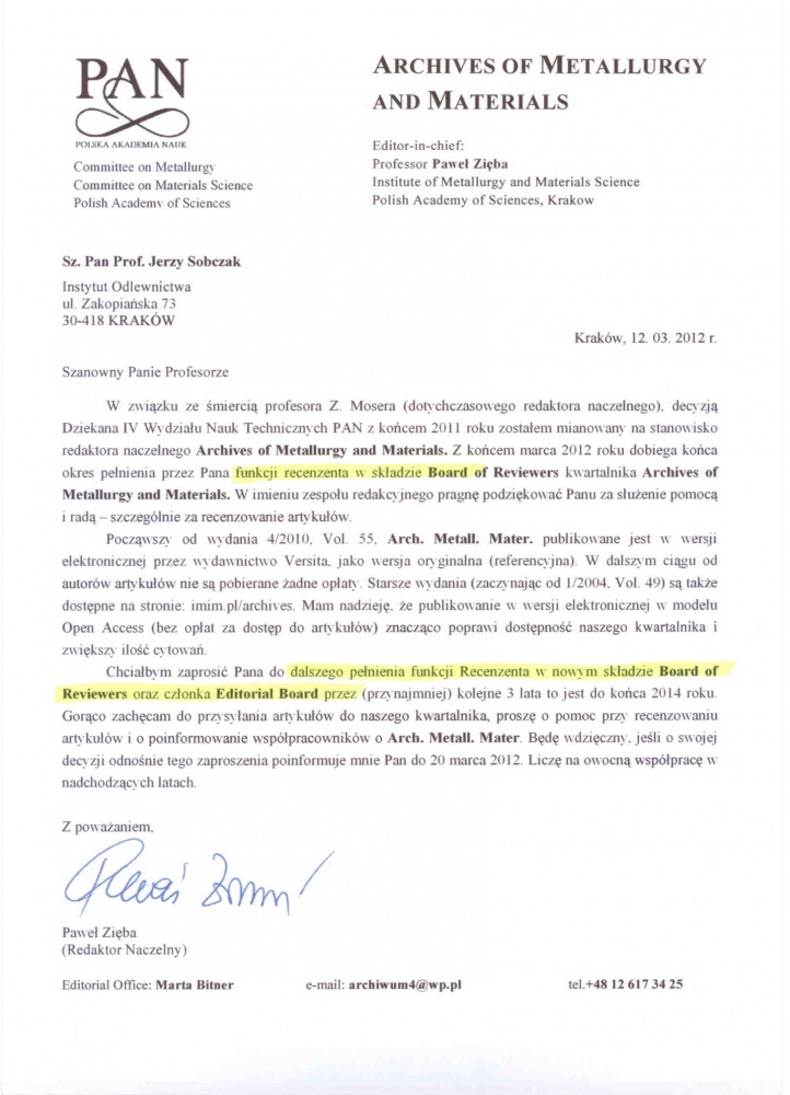 - Członek Editoral Board kwartalnika Archives of Metallurgy and Materials PAN