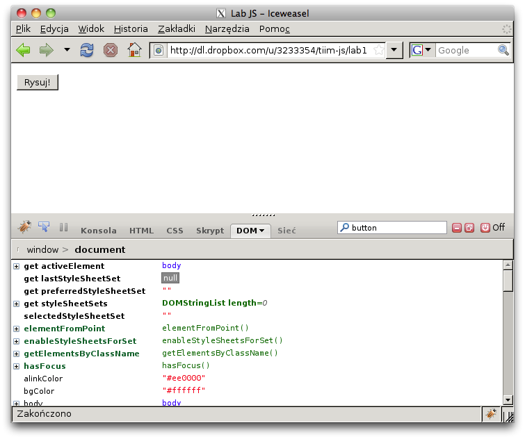 W powyższym kodzie „przy okazji” proszę zwrócić uwagę na dwie rzeczy. Po pierwsze, skorzystaliśmy z obiektu console, udostępnianego przez wtyczkę Firebug, aby pisać bezpośrednio na konsolę. Jest to bardzo użyteczne narzędzie przy debugowaniu tworzonych aplikacji webowych. Po drugie, konkatenacji stringów w JS dokonuje się przy pomocy operatora +. |
